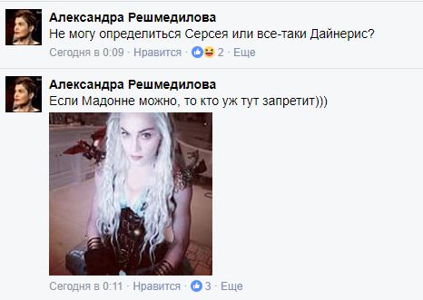 А вот эксперт Александра Решмедилова колеблется между Дейенерис и Серсеей (королева антигерой из того же сериала) - по ее мнению, Тимошенко похожа на обеих, да еще и на Мадонну заодно.