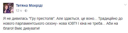 "Но, кажется, это оно... Традиционно к новому парламентскому сезону - новая ЮВТ! И кина не нужно... Лишь бы на благо! Умеет удивлять!", - написала Мокриди у себя в Facebook.