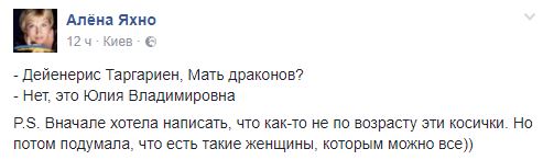 Блогер Алена Яхно сначала решила, что косички Тимошенко не по возрасту, но потом заявила, что ей "можно все". И тут же сравнила ЮВТ с Дейенерис Таргариен.