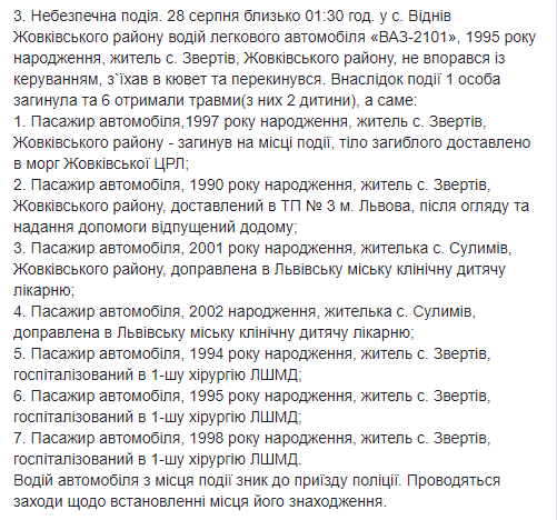 В Жолковском районе Львовской области сегодня ночью, 28 августа, произошло ДТП, в котором один человек погиб и шесть пострадали. Об этом сообщает департамент по вопросам гражданской защиты Львовской ОГА на своей странице в Facebooк.