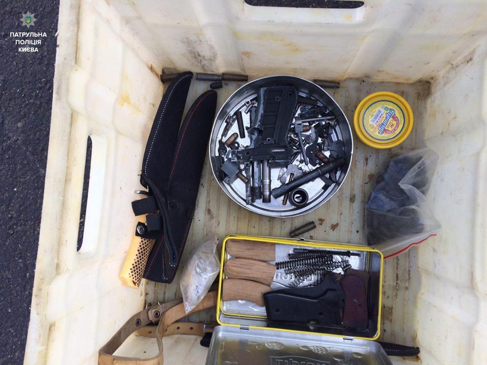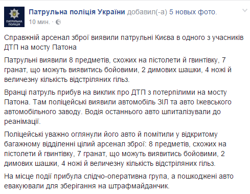 "Утром 27 августа патруль прибыл на вызов о ДТП с пострадавшими на мосту Патона. Там полицейские обнаружили автомобиль ЗИЛ и авто ижевского автомобильного завода. Водителя последнего авто госпитализировали в реанимацию. Полицейские внимательно осмотрели его авто и заметили в открытом багажном отделении целый арсенал оружия: 8 предметов, похожих на пистолеты и винтовку, 7 гранат, которые могут оказаться боевыми, 2 дымовых шашки, 4 ножи и огромное количество отстрелянных гильз," - говориться в сообщении.