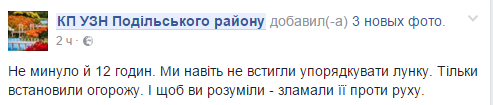 "Не прошло и 12 часов. Мы даже не успели привести в порядок лунку. Только установили ограждение. И чтобы вы понимали – сломали его против движения", – говорится в сообщении КП СЗН Подольского района в Facebook.