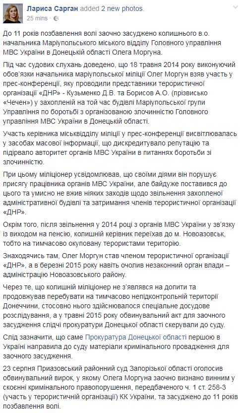 Приазовский районный суд Запорожской области заочно осудил бывшего и.о.начальника Мариупольского городского отдела Главного управления МВД Украины в Донецкой области Олега Моргуна к 11 годам лишения свободы за участие в террористической организации, сообщила пресс-секретарь генерального прокурора Украины Лариса Сарган у себя в Facebook.