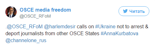"Офис представителя ОБСЕ по вопросам свободы медиа призывает Украину не арестовывать и не депортировать журналистов из других государств-членов ОБСЕ", - говорится в сообщении.