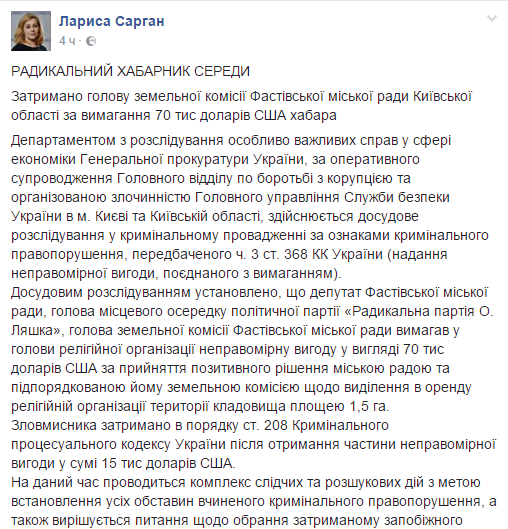 "Досудебным расследованием установлено, что депутат Фастовского городского совета, председатель местного отделения политической партии "Радикальная партия О.Ляшко", председатель земельной комиссии Фастовского городского совета требовал у главы религиозной организации неправомерную выгоду в сумме $70 тыс. за принятие положительного решения городским советом и подчиненной ему земельной комиссией о выделении в аренду религиозной организации территории кладбища площадью 1,5 га", - сообщила пресс-секретарь генпрокурора Лариса Сарган на странице в Facebook в среду.