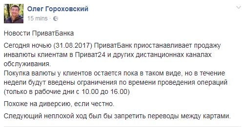 "Сегодня ночью (31.08.2017) Приватбанк приостанавливает продажу инвалюты клиентам в Приват24 и других дистанционных каналах обслуживания", - написал эксперт.