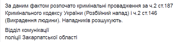 По данному факту возбуждено уголовное производство по ч. 2 ст. 187 Уголовного кодекса Украины (разбойное нападение) и ч. 2 ст. 146 (похищение человека), нападавших ищут.