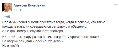 "Слеза умиления у меня проступит тогда, когда я поверю, что такие походы в магазин совершаются регулярно и обыденно. А не для камеры "случайного" блоггера", - иронизирует бывший министр ЖКХ Алексей Кучеренко.