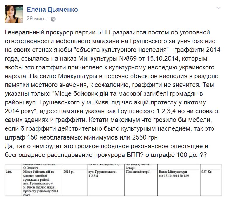 "Генеральный прокурор разразился постом об уголовной ответственности мебельного магазина на Грушевского за уничтожение на своих стенах якобы "объекта культурного наследия" - граффити 2014 года, ссылаясь на наказ Минкультуры №869 от 15.10.2014, которым якобы это граффити причислено к культурному наследию украинского народа. На сайте Минкультуры в перечне объектов наследия в разделе памятки местного значения, к сожалению, граффити не значится. Там указаны только "Місце бойових дій та масової загибелі громадян в районі вул. Грушевського у м. Києві під час акцій протесту у лютому 2014 року", адрес объекта указан как Грушевского 1,2,3,4. Но ни слова о граффити. Кстати максимум что грозило бы мебели, если б граффити действительно было культурным наследием, так это штраф 150 необлагаемых минимумов или 2550 грн. Да, так о чем будет это громкое победное резонансное блестящее и беспощадное расследование прокурора БПП? О штрафе в 100 дол?", - написала в своем посте юрист.