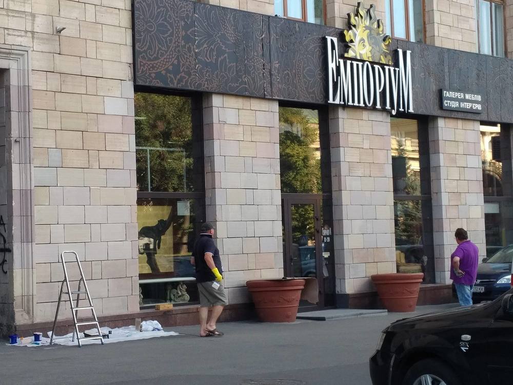 В субботу, 2 сентября, сестра народного депутата Надежды Савченко Вера сообщила, что работники мебельного магазина "Эмпориум" по адресу Грушевского, 4, смыли с фасадных стен здания граффити времен Майдана.