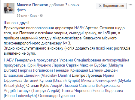 "Учитывая высказывания директора НАБУ Артема Сытника о том, что Поляков является психически больным, сегодня утром, как и обещал, я прошел медицинский осмотр у врача-психиатра Киевского городского психоневрологического диспансера №3", - написал Поляков.