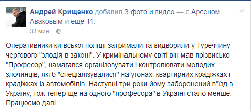В Киеве полиция задержала и выдворила в Турцию "вора в законе" по прозвищу "Профессор". Об этом в Facebook сообщил глава столичной полиции Андрей Крищенко.