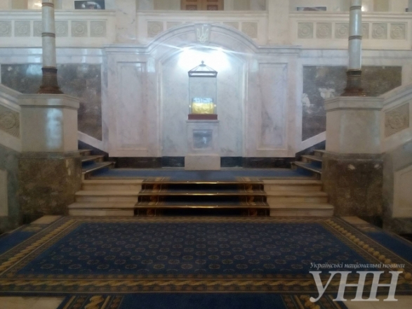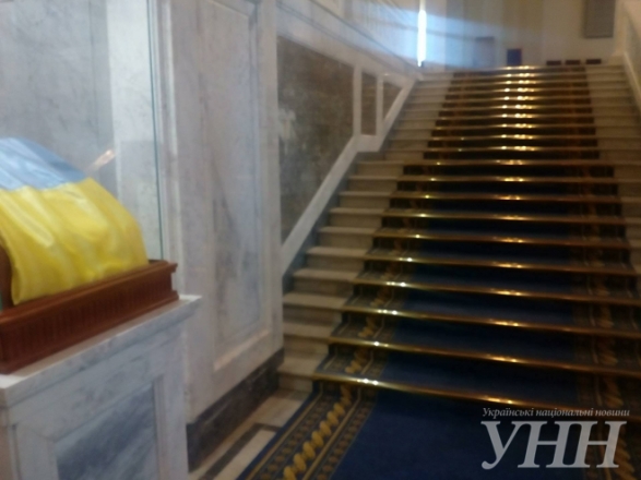 В кулуарах Верховной Рады заменили ковры и в специальном стеклянном боксе разместили государственный флаг Украины, который был внесен в парламент сторонниками независимости Украины во главе с Вячеславом Чорновилом. Об этом сообщает УНН.