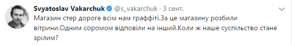 Певец и лидер группы "Океан Эльзи" Святослав Вакарчук написал пост в Twitter, в котором раскритиковал погром магазина "Эмпориум " в Киеве, где радикалы в отместку за уничтожение граффити времен Майдана, разбили окна и исписали стены.