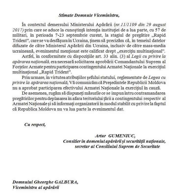 Додон опубликовал свое письмо в ответ замминистру обороны Георге Галбурой, который в конце августа сообщил президенту об участии 57 военных в учениях Rapid Trident, которые пройдут на Яворовском полигоне во Львовской области, для подготовки к миротворческой миссии в Косово.