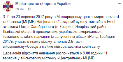 С 11 по 23 сентября в Международном центре миротворчества и безопасности Национальной академии сухопутных войск имени гетмана Петра Сагайдачного во Львовской области будут проходить украинско-американские командно-штабные учения с привлечением войск Rapid Trident-2017. Об этом сообщает пресс-служба Минобороны.