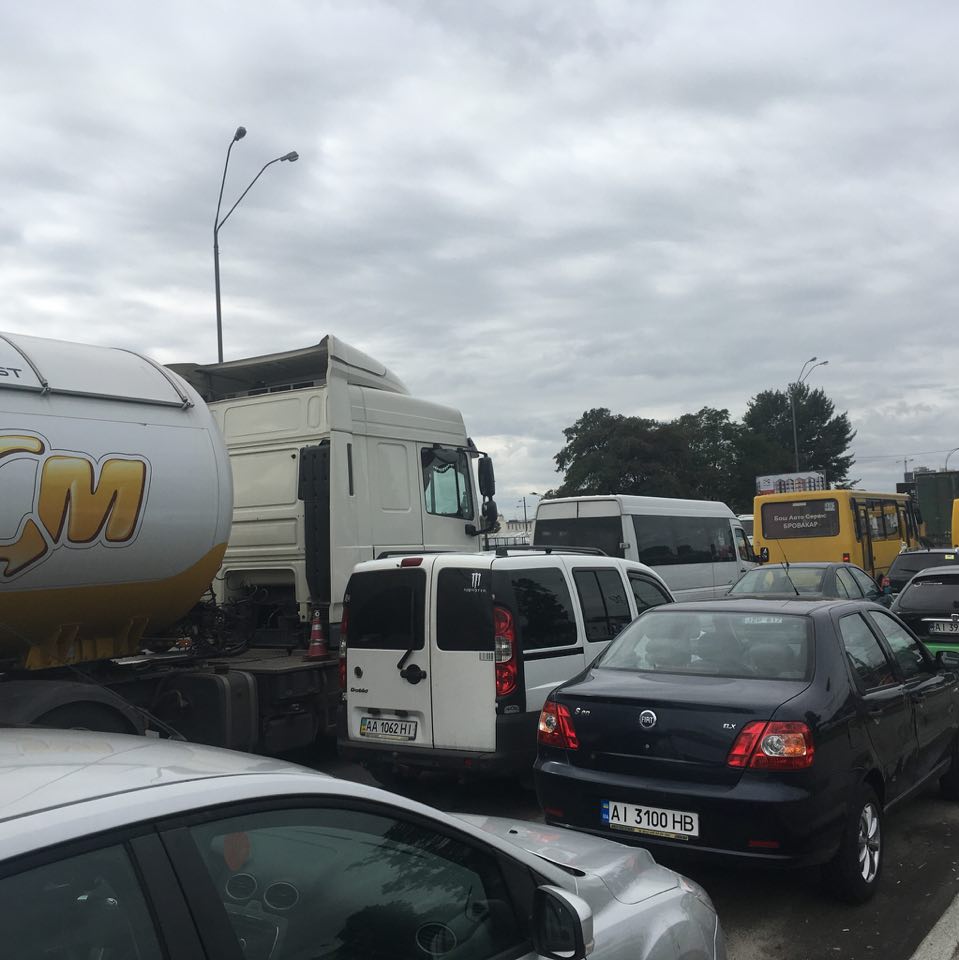 Фура въехала в легковушку, которая некорректно перестраивалась в третий ряд, тем самым заблокировав движение по Броварскому проспекту практически полностью.