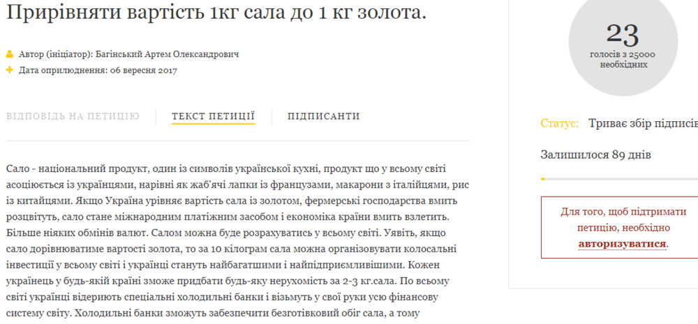 Президента Петра Порошенко просят стоимость сала в Украине приравнять к цене золота и ввести его как расчетную валюту.
