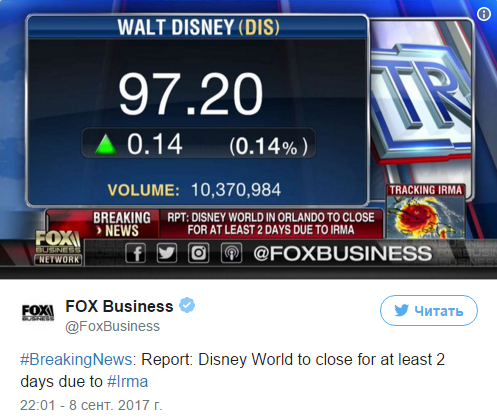 Крупнейший центр развлечений в мире "Диснейуорлд" (Disney World), в американском штате Флорида, закрывают по меньшей мере на два дня в связи с приближающимся ураганом "Ирма". Об этом сообщает Fox Business в twitter.