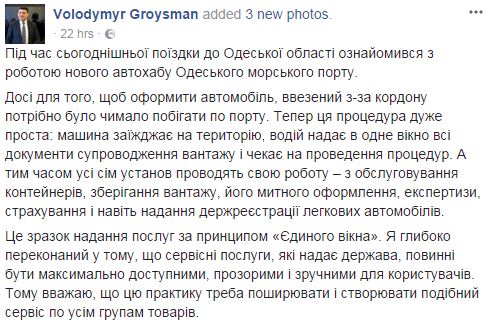 В Одессе накануне открылся административный центр, который работает по принципу единого окна для оформления авто, ввезенных из третьих стран. Так называемый автохаб работает на базе Морского порта Одессы. Фото с открытия автохаба выложил премьер-министр Владимир Гройсман на своей странице в Fаcebook.