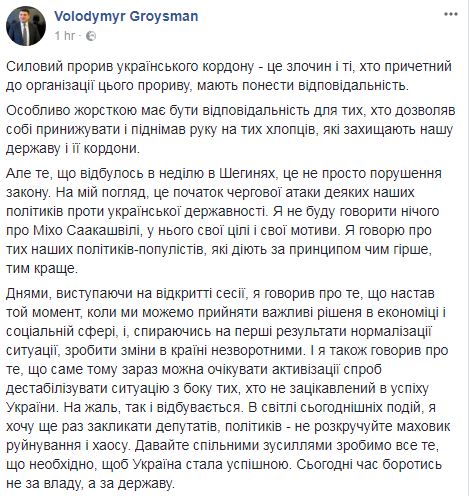 Премьер-министр Владимир Гройсман назвал преступлением прорыв украинской границы экс-главой Одесской ОГА Михаилом Саакашвили и его сторонниками. Об этом глава правительства написал в Facebook.