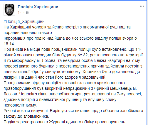 В городе Лозовая Харьковской области мужчина средь белого дня стрелял из окна своей квартиры на 7 этаже из пневматического ружья и ранил 14-летнего мальчика. Об этом сообщает пресс-служба местной полиции в Facebook.