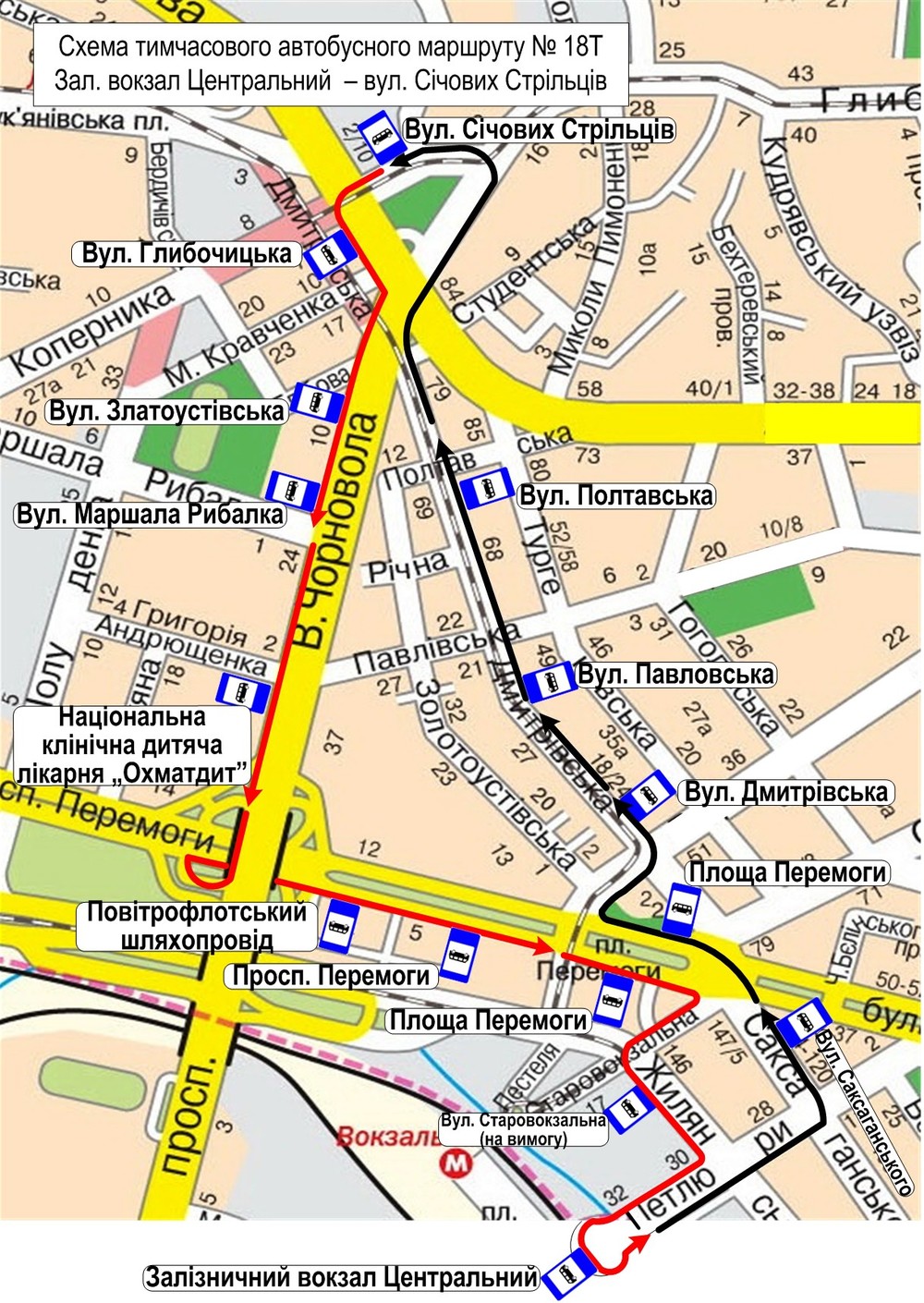 Работу временного автобусного маршрута №18 "Железнодорожный вокзал "Центральный" - улица Сечевых Стрельцов" организовано по маршруту: ул. Симона Петлюры - ул. Саксаганского - пл.Победы - ул. Бульварно-Кудрявская - ул. Дмитриевская - ул. В. Черновола - Глыбочицкий проезд - ул. Глыбочицкая - ул. Сечевых Стрельцов - ул. В. Черновола - просп. Победы - пл. Победы - ул. Старовокзальная - ул. Жилянская - ул. Симона Петлюры".