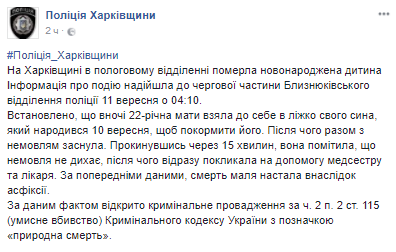 Информация о происшествии поступила в дежурную часть Близнюковского отделения полиции 11 сентября в 4.10. 22-летняя мать взяла к себе в кровать своего сына, который родился 10 сентября, чтобы покормить его.