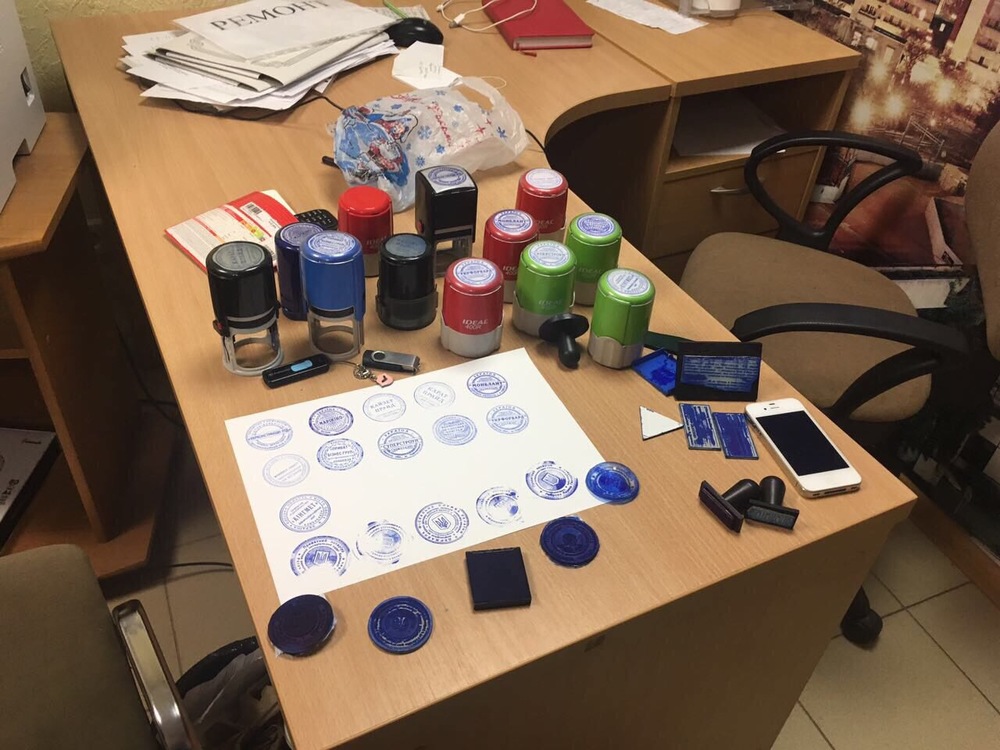 Также изъяты бухгалтерские документы и черновые записи, подтверждающие противоправную деятельность, поддельные печати органов государственной власти и печати предприятий с признаками фиктивности, нерезидентов, штампы и печати нотариусов.