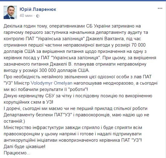 "Несколько часов назад оперативники СБУ задержали с поличным первого заместителя начальника департамента аудита и контроля ОАО "Украинская железная дорога" Джакели Вахтанга при получении первой части неправомерной выгоды в размере 70 тысяч долларов за решение вопроса о назначении на одну из руководящих должностей в ПАО "Украинская железная дорога", - заявил Лавренюк.