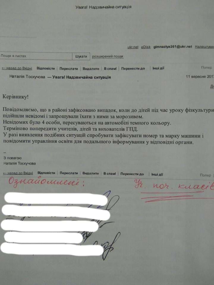 "Всем родителям на заметку. Учительница в школе на улице Вербицкого предоставила родителям информацию. Передайте всем детям, чтобы они не принимали приглашения незнакомцев проехать за мороженым. Особенно это касается старшеклассниц. Был зафиксирован случай, когда во время урока физкультуры на свежем воздухе к детям подошли неизвестные и предложили прокатиться", — об этом говорится в документе, который публикуют родители.