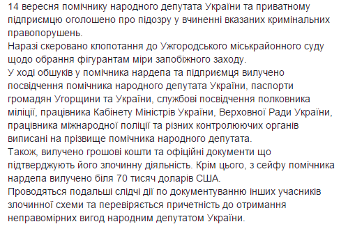 В ходе обысков у помощника нардепа изъяты паспорта Венгрии и Украины, служебные удостоверения полковника милиции и работника Кабмина, Верховной Рады, международной полиции и различных контролирующих органов. Кроме этого, из сейфа помощника нардепа изъято около 70 000 долларов США.