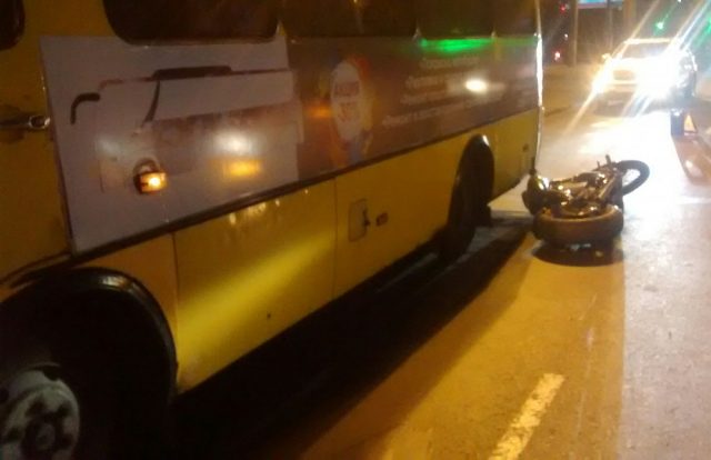 Водитель мотоцикла Suzuki, выехавший на встречную полосу, сбил на женщину, которая переходила проезжую часть в неустановленном месте. После наезда на женщину мотоцикл потерял управление и врезался в маршрутный автобус БАЗ, стоящий на остановке для посадки и высадки пассажиров.
