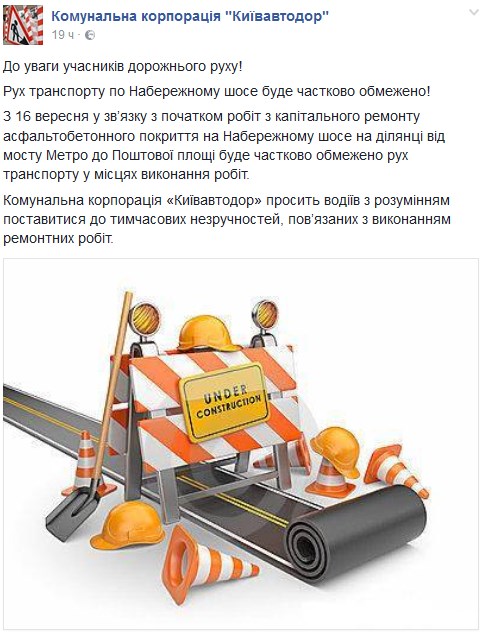 Комvунальная корпорация "Киевавтодор" просит водителей с пониманием отнестись к временным неудобствами, связанными с выполнением ремонтных работ.