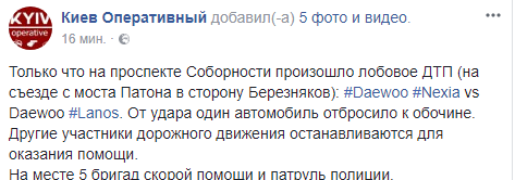 Инцидент произошел на съезде с моста Патона в сторону Березняков. Столкнулись Daewoo Nexia и Daewoo Lanos. От удара один автомобиль отбросило к обочине.