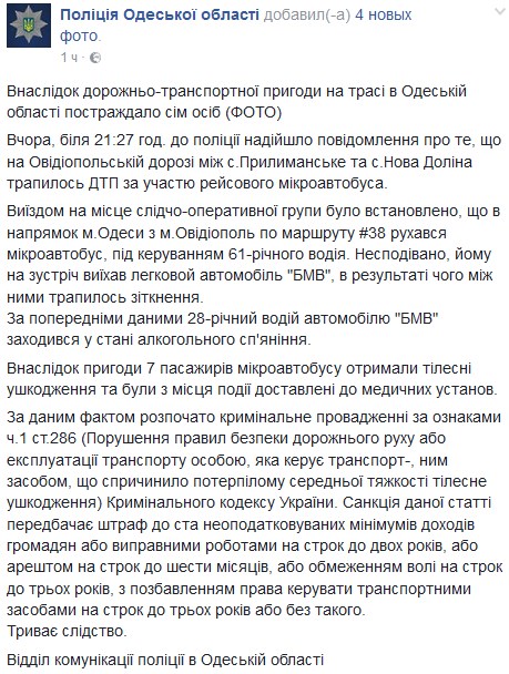 "По данному факту начато уголовное производство по признакам ч.1 ст.286 (нарушение правил безопасности дорожного движения). Санкции статьи предусматривает штраф до 100 необлагаемых минимумов доходов граждан или исправительными работами на срок до 2 лет, или арестом на срок до 6 месяцев, или ограничением свободы на срок до 3 лет с лишением права управлять транспортными средствами на срок до 3 лет или без такового ", - говорится в сообщении.