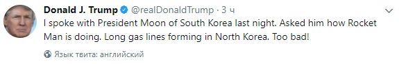 "Я говорил с президентом Южной Кореи. Спросил его, как поживает "ракетный человек". В КНДР выстраиваются длинные очереди за бензином. Очень плохо!" - написал Трамп.