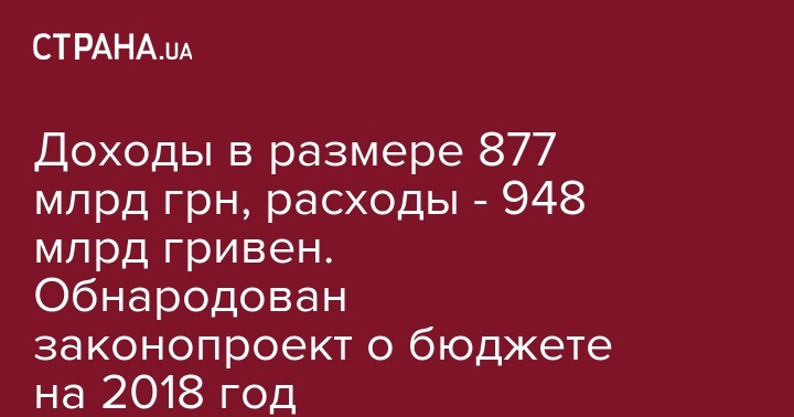 Доходы в размере 877 млрд грн, расходы - 948 млрд гривен. Обнародован законопроект о бюджете на 2018 год
