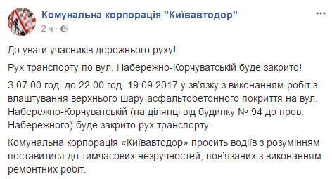 Улицу Набережно-Корчеватскую в Киеве 19 сентября частично закроют для проезда транспорта. С 07:00 до 22:00 коммунальщики будут проводить ремонт дорожного покрытия на участке от дома № 94 до пер. Набережного.