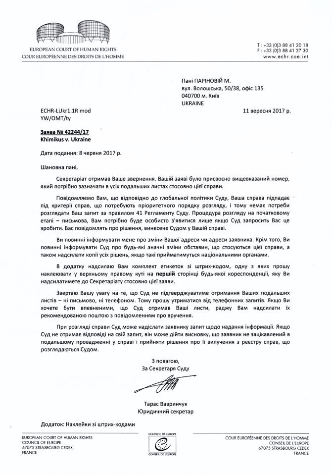 "Европейский суд по правам человека принял жалобу Химикуса на неэффективное расследование и признал ее приоритетной", - заявила она на своей странице в Facebook.