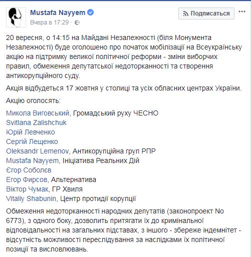 "20 сентября в 14:15 на Майдане Незавимисоти (около Монумента Независимости) будет провозглашено начало мобилизации на Всеукраинскую акцию в поддержку большой политической реформы — изменения избирательных правил, ограничения депутатской неприкосновенности и создания антикоррупционного суда. Акция пройдет 17 октября в столице и всех областных центрах Украины", - написал бывший журналист.