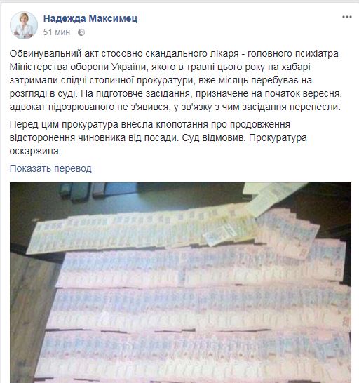"Обвинительный акт в отношении скандального врача - главного психиатра Министерства обороны Украины, которого в мае этого года на взятке задержали следователи столичной прокуратуры, уже месяц находится на рассмотрении в суде. На подготовительное заседание, назначенное на начало сентября, адвокат подозреваемого не появился, в связи с чем заседание перенесли", - написала Максимец