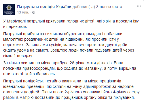 В Мариуполе патрульные спасли голодных детей, которые из окна просили еду у прохожих. Об этом сообщает патрульная полиция Украины в Facebооk.