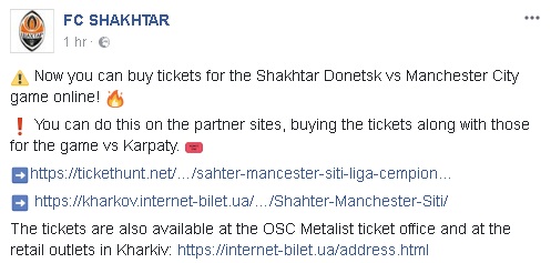"Приобрести билеты на матч "Шахтер" – "Манчестер Сити" теперь можно онлайн! Вы можете это сделать на сайтах-партнерах, покупая их вместе с билетами на игру с "Карпатами", – говорится в Facebook "Шахтера".