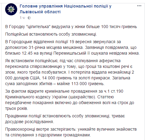 "Во время общения аферистка убедила собеседницу, что деньги и ценные вещи – это зло, от которого надо избавляться. И потерпевшая отдала незнакомке 2 тыс. долларов, 14 тыс. гривен и золотые украшения", – сообщает львовская полиция.