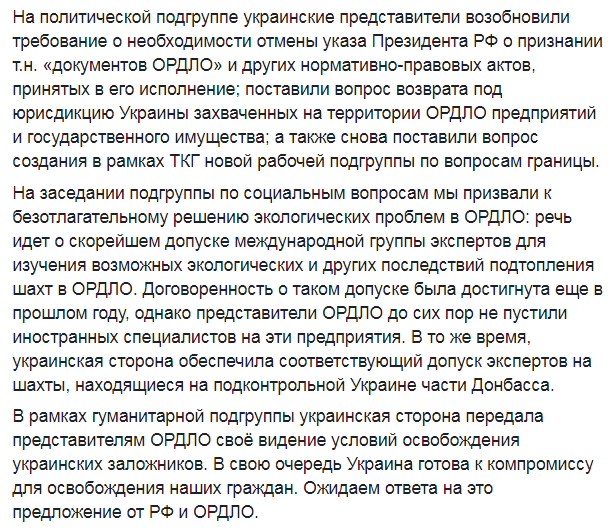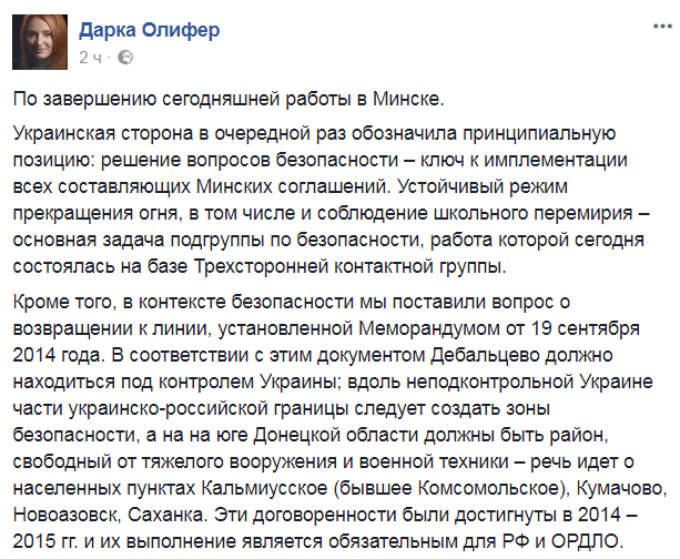 "Кроме того, в контексте безопасности мы поставили вопрос о возвращении к линии, установленной Меморандумом от 19 сентября 2014 года. В соответствии с этим документом Дебальцево должно находиться под контролем Украины; вдоль неподконтрольной Украине части украинско-российской границы следует создать зоны безопасности, а на на юге Донецкой области должны быть район, свободный от тяжелого вооружения и военной техники – речь идет о населенных пунктах Кальмиусское (бывшее Комсомольское), Кумачово, Новоазовск, Саханка. Эти договоренности были достигнуты в 2014 – 2015 гг. и их выполнение является обязательным для РФ и ОРДЛО", - заявила Олифер.