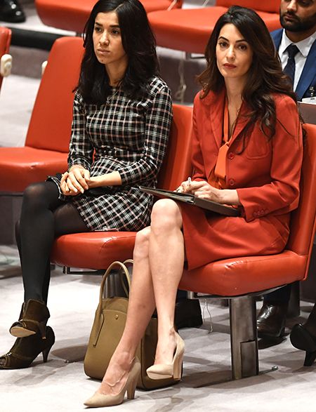 Амаль Клуни была одета в алый юбочный костюм Bottega Veneta, который дополнила ярко-оранжевой блузкой. Завершали образ нюдовые лодочки Manolo Blahnik и массивная деловая сумка Michael Kors.