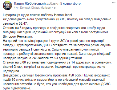 Сотрудники ГосЧС ликвидировали пожар в 5.47. "По состоянию на 8.00 проведено заседание оперативного штаба по ликвидации последствий чрезвычайных ситуаций во главе с моим заместителем Виктором Ремским", - написал Жебривский.