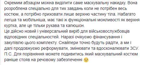 "Свободная конструкция комплекта обеспечивает максимальную свободу движений, скрывает очертания человека, позволяет использовать в качестве верхней одежды, надевать на одежду нижние слои, снаряжение. Почти по всей поверхности комплекта размещена швартовочная сетка, с помощью которой возможно замаскировать себя согласно поставленных задач, местности и погодных условий ", - говорится в сообщении.