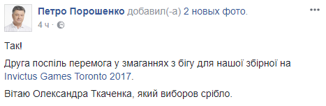 "Именно так! У нас серебро! И нас не остановить! Александр Ткаченко, 29 лет, Чернигов, Национальная полиция Украины, получил "серебро" на дистанции 400 м. Своим примером Александр доказывает, что ранения - не повод отказываться от занятий спортом. Более того - это возможность начать им заниматься", - говорится в сообщении.